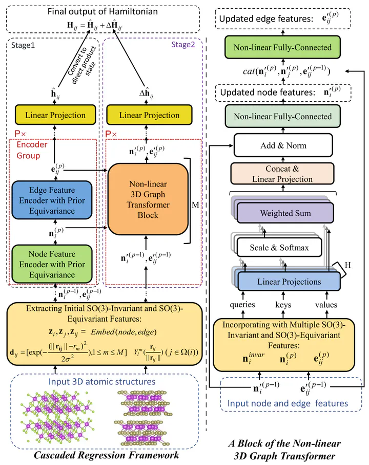 Deep learning for predicting the electronic-structure Hamiltonian of quantum systems necessitates satisfying the covariance laws, among which achieving SO(3)-equivariance without sacrificing the non-linear expressive capability of networks remains unsolved. To navigate the harmonization between SO(3)-equivariance and expressiveness, we propose HarmoSE, a deep learning method synergizing two distinct categories of neural mechanisms as a two-stage encoding and regression framework. The first stage corresponds to group theory-based neural mechanisms with inherent SO(3)-equivariant properties prior to the parameter learning process, while the second stage is characterized by a non-linear 3D graph Transformer network we propose, featuring high capability on non-linear expressiveness. Their combination lies in the point that, the first stage predicts baseline Hamiltonians with abundant SO(3)-equivariant features extracted, assisting the second stage in empirical learning of equivariance; and in turn, the second stage refines the first stage’s output as a fine-grained prediction of Hamiltonians using powerful non-linear neural mappings, compensating for the intrinsic weakness on non-linear expressiveness capability of mechanisms in the first stage. Our method enables precise, generalizable predictions while capturing SO(3)-equivariance under rotational transformations, and achieves state-of-the-art performance in Hamiltonian prediction tasks under multiple Mean Absolute Error (MAE) metrics, such as the average MAE across all samples and matrix elements, the MAE for challenging samples, the MAE for different Hamiltonian blocks, and the MAE for the challenging blocks. It also demonstrates significant improvements in accuracy for downstream quantities, such as occupied orbital energy and the electronic wavefunction, as measured by MAE and cosine similarity, respectively.